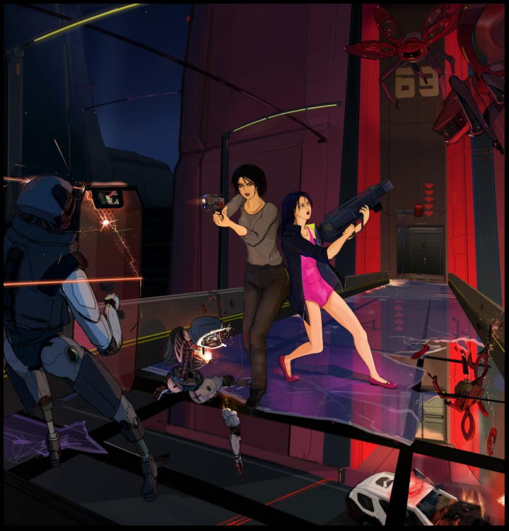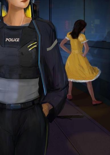 | 1章 路地裏の少女とカーラ 《3001》 ◆封鎖ゲート 《祭典初日》 祭典の賑わいとは正反対の寂れた通りの高架下にパトカーをとめ、カーラはため息をつきながら降りてきた。 ミディアムショートの黒髪から覗く大げさなコートの襟は様々なセンサーが搭載され黒い瞳を照らし、頑強な造りが、背の高い彼女をより大きく見せ、上腕には対アンドロイド班のエリートの証である青いラインが走っている。 カーラの正面、少し低い位置に商業ビル用の広い駐車場があり、その先に封鎖したゲートが見える。巨大な信号が赤色を示し、通行止めの黄色いビームが道路を横切っていた。 封鎖ゲートでは、既に「相棒」と呼ばれているロボットが到着していて、起動したフェンスの前で待機していた。 祭典の警備中に呼び出されたため、可愛らしい赤帽子をかぶせられたままなのが滑稽だ。 「可愛いじゃない。似合ってるわよ。」 相棒に声をかけると、警備ロボはカーラを見て可愛い仕草で手を振った。 同僚の人間よりよっぽど愛嬌がある。 いま、警備班が逃走車を「大劇場の祭典」から遠ざけるように追跡し、このゲートへ誘導されたところを捕える手筈だ。 カーラはゲートから離れ、抜け道が無いか周辺の確認をはじめた。外出を制限している為、通りに人の気配はないが、左手の劇場からは賑やかな音楽が漏れ聞こえてくる。 その小劇場ビルの路地裏で子供が一人でいるのを見つけた。 あざやかなピンク色の長いドレスをまとって出演前の練習をしている様だが、控室が無いのか外出制限が出ている状況にも関わらず、ビルの窓を使って練習をしている。 長い黒髪は背中までまっすぐ伸びて顔は見えないが、まだ15歳前後に見え、カーラは胸が締め付けられる思いがした。 避難を促すため少女に近づこうとしたが、ガラスを見据えて集中する姿に、張り詰めた雰囲気を感じて他の見回りを終えてから声掛けをする事にした。 道の端まで確認を終えると、そこから祭典が行われているエリアを眺める。 (さすがに今夜は街が明るいな。)夜空にはうっすらと天井も見えた。 溜息の前に空気を深く吸い込む。カーラはこの古い街にもアンドロイドが押し寄せ、人間が住み家を追われている事を実感していた。 決して豊かではないこの層は昼夜問わず仕事をしている子供も多く、通りをうろつくアンドロイドの狂暴化が問題になっている。 住民を守り治安を維持する事。それが対アンドロイド班(対策班)を設立した意義であり、ここの子供たちの未来につながると信じている。 (居場所を守らねばならない。) 逃げ出したい衝動を抑えるように、そう自分に言い聞かせた。 カーラはパトカーに戻る前に、まだ路地裏でダンスの練習をしていた少女に避難するよう声をかけた。 しかし少女はうなずくだけで振り返りもしない。その様子に違和感を覚え、顔認証センサーを起動し近づいた。 「危険だからすぐ非難して。家はどこ?」肩に手をかけ無理やり振り向かせる。 すぐにコートの襟に搭載されたセンサーから顔認証が始まったがシステムからの応答がない。通信が不安定の様だ。 「わかりました。帰ります。この劇場だから一人で大丈夫。」 少女はセンサーから顔をそむけるようにして答えると、きびすを返して建物の方へ向ってい歩いて行ったが、その足取りは重そうだった。 カーラに追跡の状況をつたえる無線が入ってくるがノイズが酷く聞き取れない。 稀に層の空間や、外の嵐の影響で通信システムが使えなくなる瞬間がある。 (ここの場所が悪いのか、あまり時間がないな。)パトカーの無線を試すために戻ろうしたとき、襟元の無線から耳を突くようなノイズ音が鳴り思わず顔をそらした。その後、無線から何も聞こえなくなった。 思わず舌打ちする。準備が万全ではない状態に焦りがでる。 「そっちは異常はない?!」大きな声で相棒に声をかけるが、ゲートにいる相棒はただ空を見上げている。 (ホントにいざという時、使えない!)カーラは高架下のパトカーへ向かって駆けだした。 その瞬間、カーラは視界が真っ白になったと思う間もなく、背中にすさまじい力で蹴り飛ばされるような衝撃を受けて、 前のめりで地面にたたきつけられた。封鎖ゲートが爆発。 そこに立っていた相棒は閃光の中へ消え、頭が彼方へ飛んでいった。 周辺から一斉に警報が鳴り響きだしていた。 「うっ。・・ううう」カーラは痛みに呻きながら目を開けた。後方で何かが爆発したことは分かる。 事故か攻撃か、大きな耳鳴りだけが聞こえ、ゲート付近は砂埃と煙でよく見えない。 自分自身がどういう体勢で倒れているかが分からなかった為、慎重に手足を動かし確かめた。 ぶつけた顎が痛むが、幸い頭は強く打っていない。 (退避しないと・・また爆発が起きる前にパトカーへ) だが、カーラはふと先ほどの少女の事を思い出した。 (彼女は無事だろうか・・。自分の声掛けが遅くて、彼女を爆発に巻き込んでしまったかもしれない。まだ近くにい