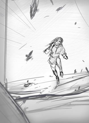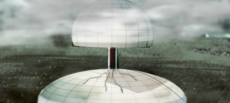 | カーラはシエン達が乗るエレベーターとは別の、表示もドアもない壁からすり抜けるように現れた。 壁は液体の波紋の様に波をうつとすぐに平らな壁に戻った. 「これは・・。」天井裏に出た瞬間、目の前に広がる風景と状況に言葉が詰まった。大量のドローンが天井に開いた窓から空へ吸い込まれて、壁に押し潰された機械の残骸が足元を埋め尽くしている。 想像を超えるスケールでの戦いが行われた跡だ。 『これは、君の仲間とコウがやったのだな。』壁の中からコウに似た人物が降りて、カーラに話しかけた。 「みんなはどこに?」 人物は空を指さした。 カーラがその方向へ視線を向けると、コウやマシーナの姿が見えて手を振った 「マシーナ!聞こえる?無事なの?今、天井裏についたわ!」コウやマシーナの姿が見えカーラは手を振った。 外にいるマシーナは無線に反応して、開いた天井から下を覗いている。 《カーラ?いるの?》 「すぐ下にいるわ。危ないから覗かなくていい。」 《カーラ?天井裏に上がったのか?どうやって。》その無線からシエンの声も聞こえる。 カーラは何と説明したらよいかわからなかった。振り返って名前を聞こうとしたときそこにさっきまでいたコウに似た人物の姿はなかった。かすかに波打つ壁のエレベーターは残され、彼女の存在だけが消えたようだった。 《カーラ。外殻の通信は破壊した。天井裏の装置もおそらく機械に潰されただろう。もうカインはR層に干渉できないはずだ。》無線からテオの声がするが姿は見えない。 「テオ。私は今さっきカインと戦闘して倒したばかりよ。エレベーターから手下のロボットを追跡してカインの部屋を発見したの。少し会話もした。」 『何だって?確かにカインなのか?』 「ええ。自分でも認めた。ただ日光を動かしたのはカインではないと言っていた。」 テオは一瞬考え込んだ。「分かった。詳しい話を聞きたい。いま降りるからそこで待っていてくれ。」 テオが無線を切りエレベーターへ向かおうとした時、近くにドローンの部品が落ちてきて小さく砕けた。 (なんだ?)暗い空を見上げると、外の世界の異変に気が付いた。(嵐が弱まっている・・。) コウがモップをひねって外殻の装置を操作すると細かい振動が始まり外殻の窓が閉じ始めた。 《もう天井を閉めるぞ。挟まれたり、落ちないように注意してくれ。》 マシーナは一人であたりを見て歩いている。「マシーナすぐ戻って!危ない。」気が付いたヘラが呼び戻した。 風は一人で歩ける程度には弱まったが時折強い突風が吹く。 ガン! ドローンの頭部がテオの近くに落ちた。ハンマーで叩くような音に重量を感じる。上を見るとまだ多くの破片が上空で風の力を失い重力につかまり始めていた。 《風が弱くなった!上からドローンが落ちてくるぞ。急いでエレベータに戻るんだ!》 カラカラと小石を落とすような音が周辺から聞こえてくる。落ちてくる欠片の音が多くなってきた。 テオがエレベーターのボタンを押し全員の位置を確認していた。ヘラはタワーの陰からマシーナを呼んで待っている。 コウは一番遠いがモップのバリアを傘のようにして大丈夫そうだ。 《シエン、ドローンが落下してくる。エレベーターに入れるか》 《了解。すぐ戻る。十分撮影できた。》 マシーナは、ヘラが呼びかけても、まだ離れた場所におり、かけらが落ちてきてあわてて戻ってくるのが見えた。 近くにいたシエンがマシーナを見つけた。「マシーナ何をしている!エレベーターに戻るぞ。」